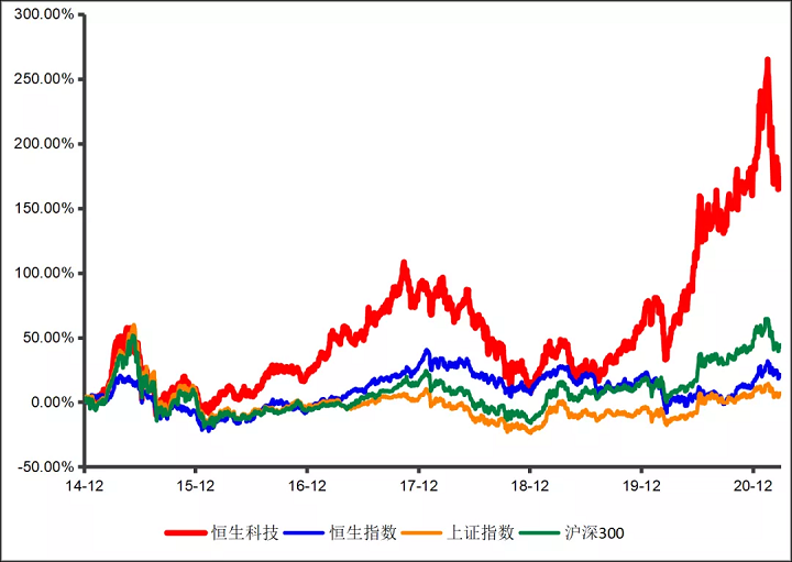 基于科技属性和优秀的基本面表现,恒生科技指数具备较强进攻性,在科技行情中超额收益显著,长期成长性优秀。如下图所示,从指数基日2014年12月31日2021年3月31日,恒生科技指数回报率显著领先恒指、沪深300和上证指数,体现了港股科技股的优良质地。